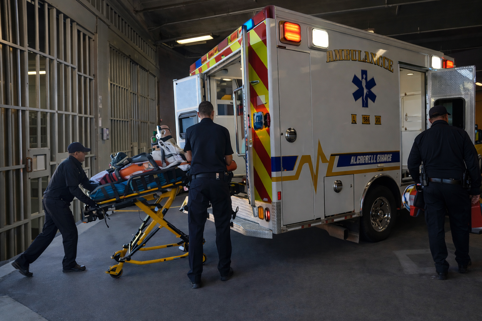Emergency personnel responding to a medical emergency inside a jail facility. Deaths in custody typically trigger investigations by jail officials, law enforcement, and medical examiners.